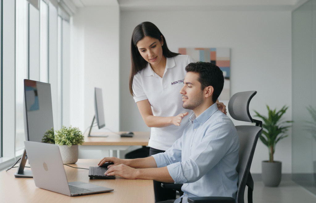 La ergonomía ocupacional busca adaptar el trabajo a las personas, garantizando su bienestar físico y su rendimiento diario. En Mentaliza realizamos diagnósticos especializados de puestos de trabajo, capacitaciones en higiene postural y planes de mejora que reducen riesgos musculoesqueléticos.